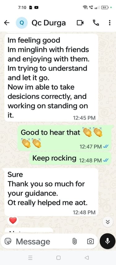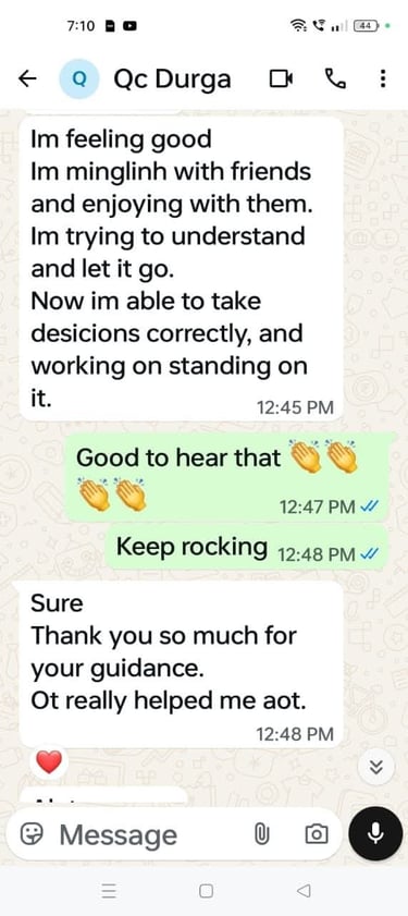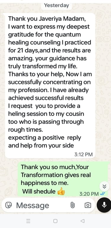 βQuantum therapy sessions with Javeriya changed my inner mindset. I feel calm, confident, and emotionally balanced within a few weeks.β